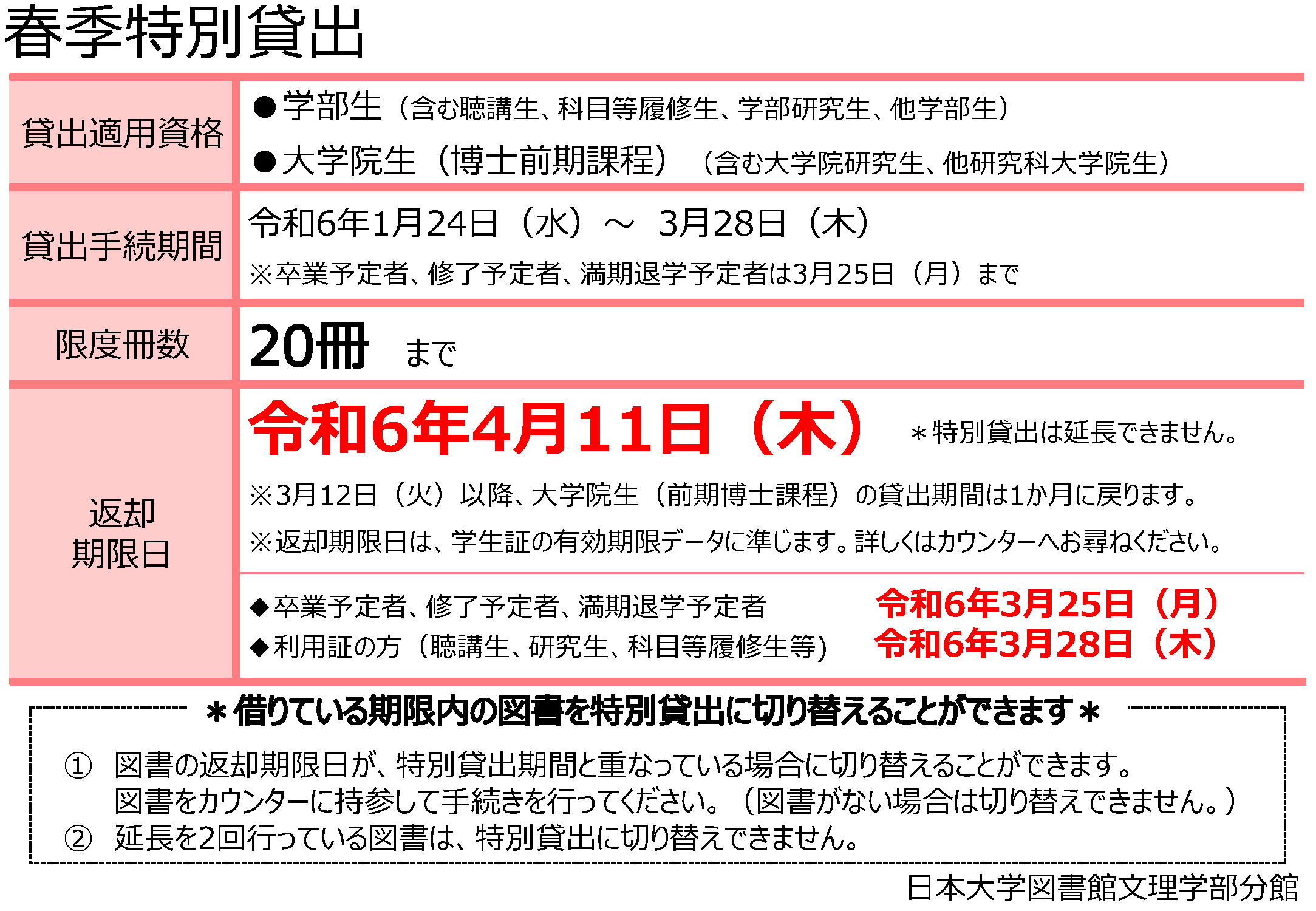 【春季特別貸出 手続き期間】 令和6年1月24日(水)~3月28日(木) ※卒業予定者,修了予定者,満期退学予定者の手続き・返却は3月25日(月)までです。お間違いのないよう,ご注意ください。