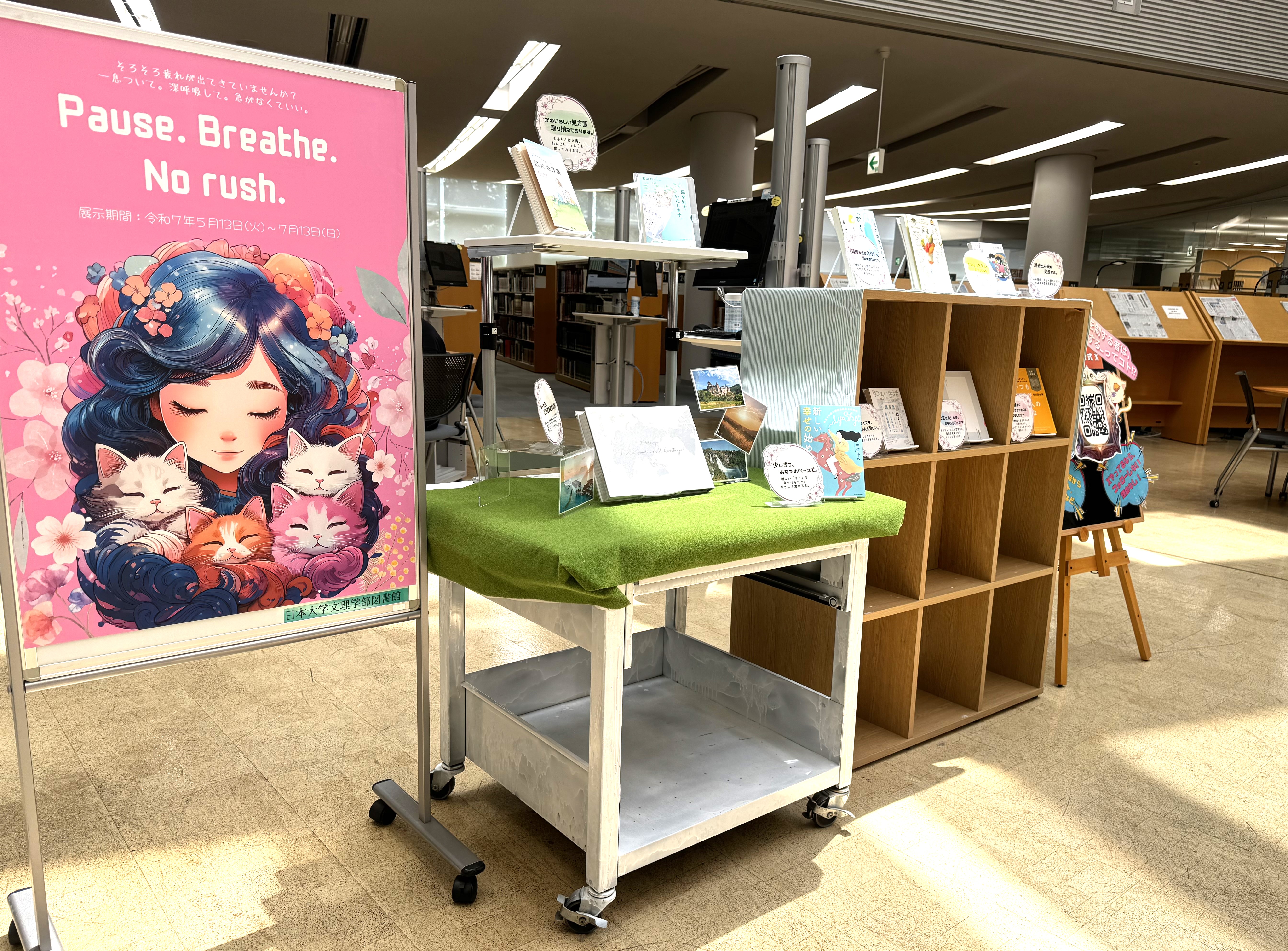 企画展示「Pause.Breathe.No rush.」を図書館1階・中央吹き抜けスペースにて開催中です。